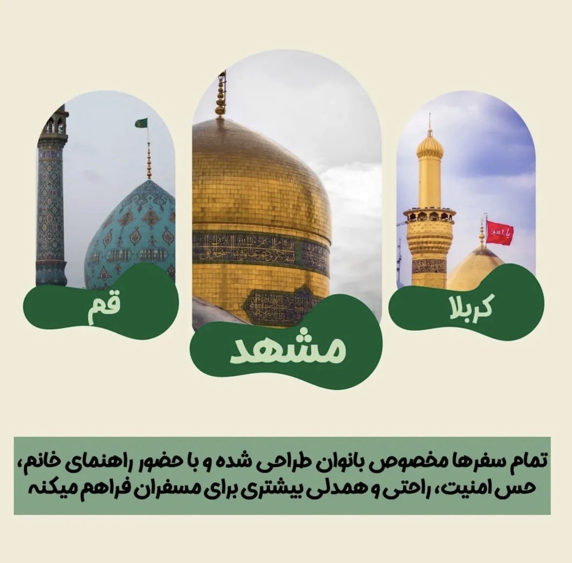 تمام سفرهای فاطیما ویژه بانوان طراحی شدهاند تا خانمها بتوانند بدون دغدغه، با احساس امنیت کامل و در محیطی دوستانه و صمیمی، به زیارت و گردش بپردازند.