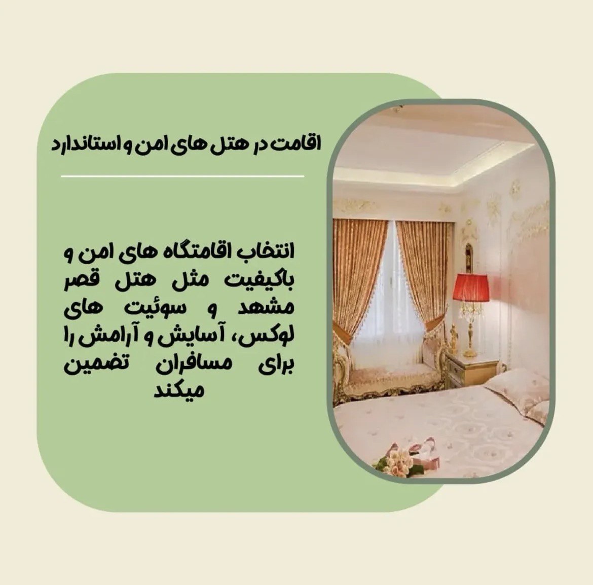 یکی از مهمترین دغدغههای هر مسافر، محل اقامت است. فاطیما با انتخاب دقیقترین اقامتگاهها، از جمله هتل قصر مشهد و سوئیتهای لوکس و مجهز، آسایش و رضایت کامل مسافران را تضمین میکند. این اقامتگاهها علاوه بر امنیت بالا، محیطی تمیز، دلنشین و آرام را فراهم میکنند تا پس از زیارت یا گردش، بتوانید استراحتی عمیق و لذتبخش داشته باشید.