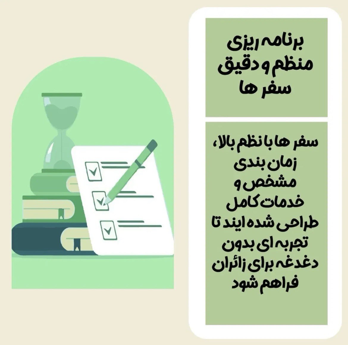 یکی دیگر از مزیتهای سفر با فاطیما، نظم و برنامهریزی دقیق در طول سفر است. تمام تورها با زمانبندی مشخص و خدمات کامل طراحی شدهاند تا تجربهای آرام، منظم و دلنشین برای مسافران فراهم شود. از لحظهی حرکت تا بازگشت، تیم فاطیما کنار شماست تا سفری راحت، ایمن و خاطرهانگیز را تجربه کنید.